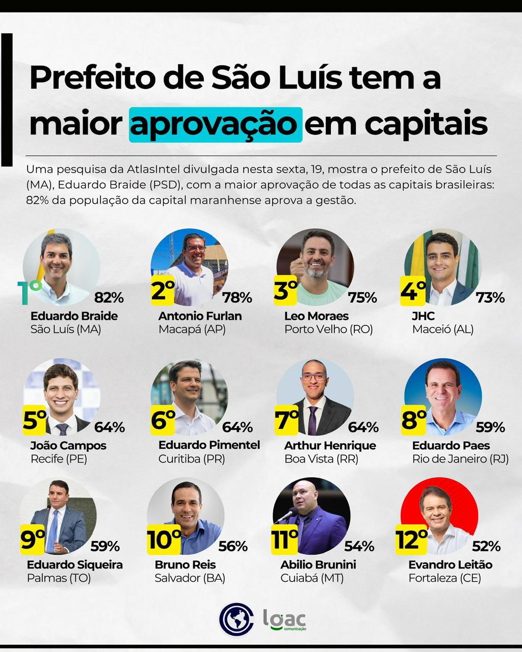 Com 82% de aprovação, Eduardo Braide consolida-se como o prefeito mais bem avaliado do Brasil, segundo a AtlasIntel. O resultado indica um alto grau de confiança da população de São Luís na administração municipal e reflete a percepção positiva sobre serviços públicos, obras, programas sociais e equilíbrio fiscal.